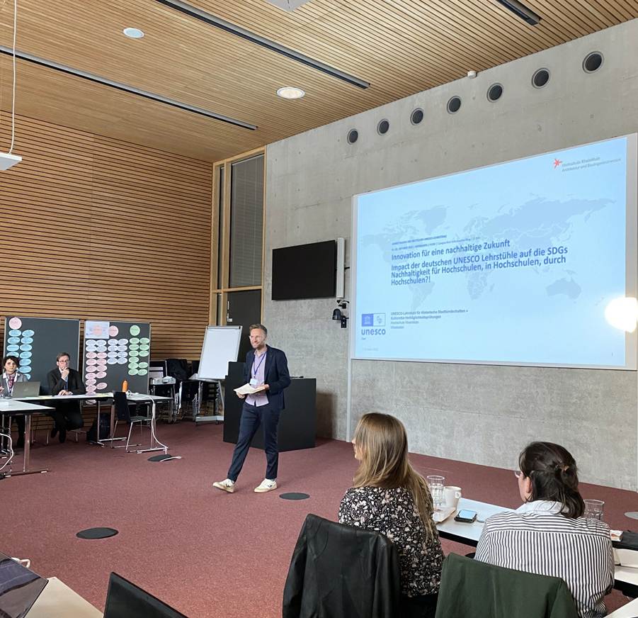 On 1–2 October 2024, the annual meeting of the network of the UNESCO Chairs in Germany took place at RheinMain University of Applied Sciences in Wiesbaden. Every two years, the network of the German UNESCO Chairs comes together for a national meeting, alternating with an international conference, to explore the response of the network to arising complexities of the present times and to foster and strengthen existing collaboration. This year's meeting was hosted by the UNESCO Chair on Historic Urban Landscapes and Heritage Impact Assessments held by Michael Kloos and the coordinator Merve Demiröz Torun. The event brought together representatives, chairholders, coordinators, and student representatives, from twelve UNESCO Chairs, including Leuphana University’s UNESCO Chair in Higher Education for Sustainable Development, represented by Chairholders Daniel Fischer and Harald Hantke, and Mariia Statkova from the Chair team.